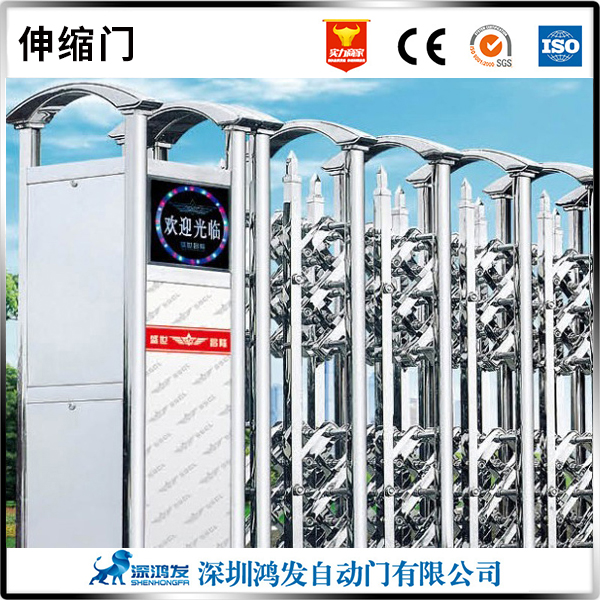 伸縮門(Retractable door),就是門體可以伸縮自由移動,來控制門洞大小、來控制行人或車輛的攔截和放行的一種門。伸縮門主要由門體、驅(qū)動電機(jī),滑道、控制系統(tǒng)構(gòu)成。門體采用優(yōu)質(zhì)不銹鋼及鋁合金專用型材制作,采用平行四邊形原理鉸接,伸縮靈活行程大。驅(qū)動器采用特種電機(jī)驅(qū)動,蝸桿蝸輪減速,并設(shè)有自動離合或手動離合器,自動離合停電時(shí)可自動啟閉,手動離合停電時(shí)可手動啟閉,控制系統(tǒng)有控制板,按鈕開關(guān),另可根據(jù)需求配備無線遙控裝置。