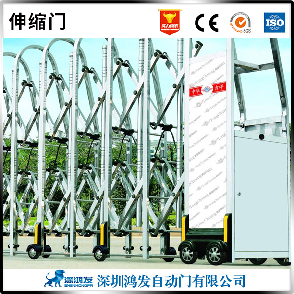 伸縮門(Retractable door),就是門體可以伸縮自由移動,來控制門洞大小、來控制行人或車輛的攔截和放行的一種門。伸縮門主要由門體、驅(qū)動電機,滑道、控制系統(tǒng)構(gòu)成。門體采用優(yōu)質(zhì)不銹鋼及鋁合金專用型材制作,采用平行四邊形原理鉸接,伸縮靈活行程大。驅(qū)動器采用特種電機驅(qū)動,蝸桿蝸輪減速,并設(shè)有自動離合或手動離合器,自動離合停電時可自動啟閉,手動離合停電時可手動啟閉,控制系統(tǒng)有控制板,按鈕開關(guān),另可根據(jù)需求配備無線遙控裝置。